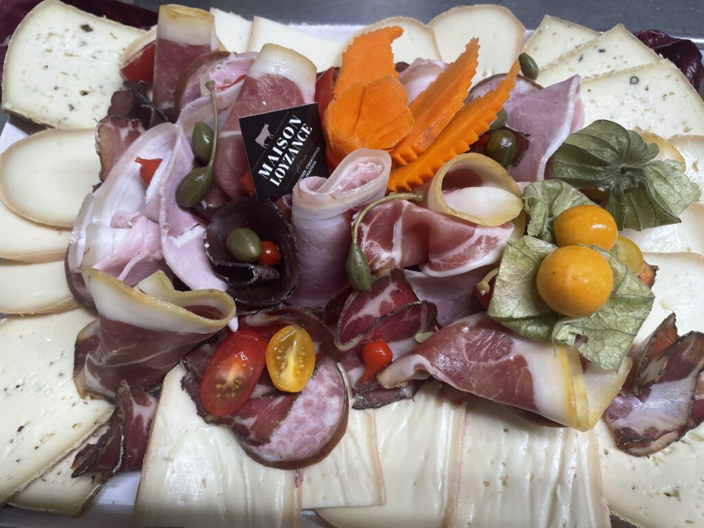 5 charcuteries aux choix avec 200g de fromage à raclette par personne, présenté sur plateau, à partir de 4 personnes.